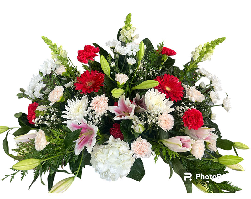 Centro funerario predominante color rojo, con flores variadas y posibilidad de cinta.