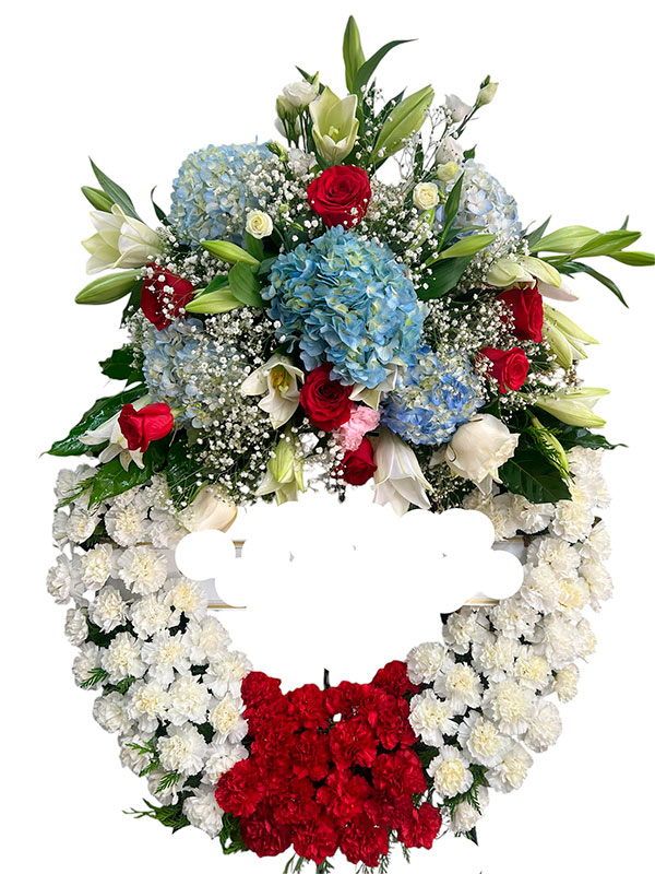 Corona de flores con aro blanco y central rojo. Cabecero con rosas, hortensias y limusinas.