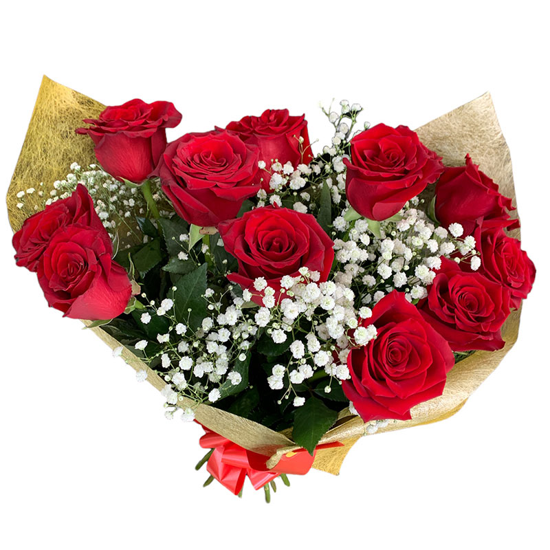 Ramo de 11 rosas rojas con eucalipto, lentisco y paniculata