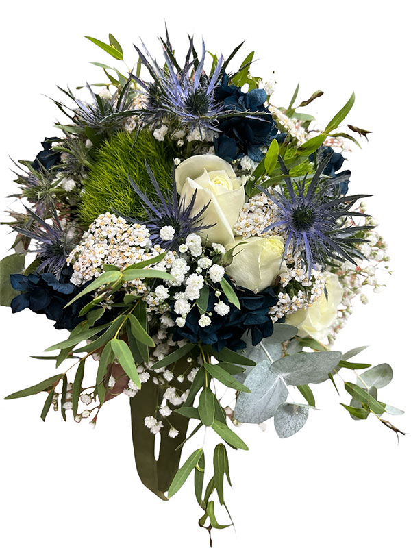 Ramo de novia natural, eryngium, eucalipto, flor de arroz, paniculata, hortensia azul oscuro y rosas blancas.