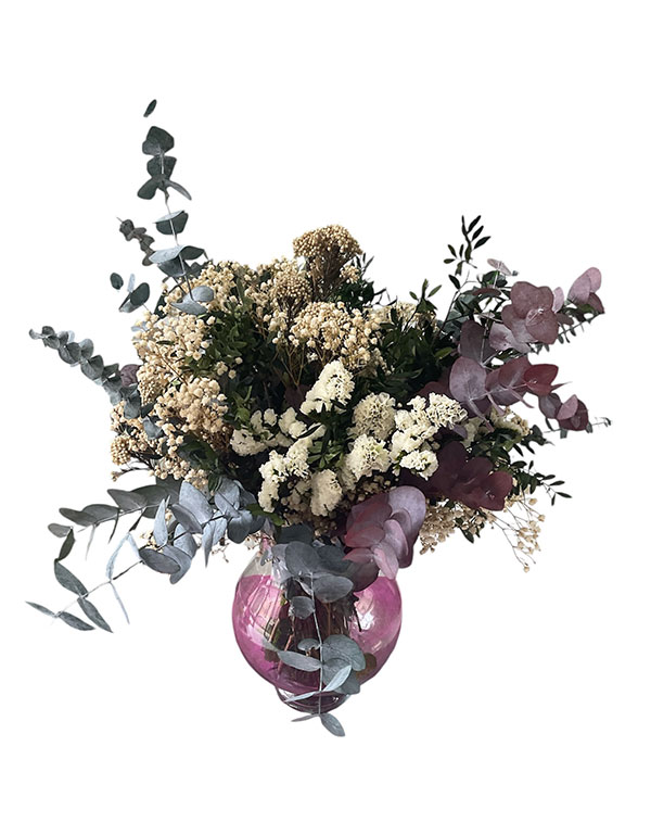 Ramo en jarrón liofilizado, tamaño grande, compuesto por eucalipto,paniculata, statice, lentisco y flor de arroz.