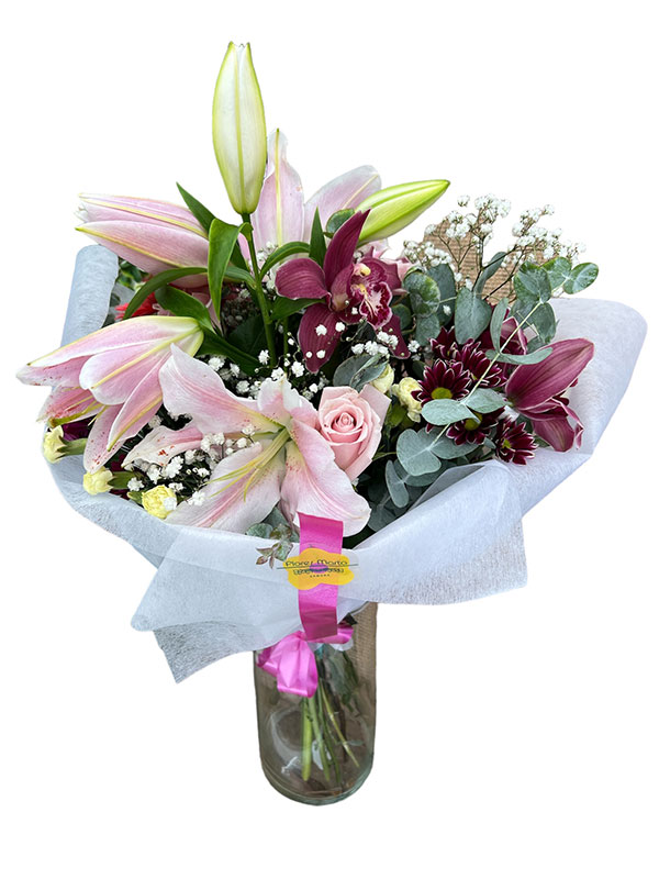 Ramo de flores compuesto por stargathe, orquídeas, paniculata, eucalypus, rosas, crisantemos y clavelina.